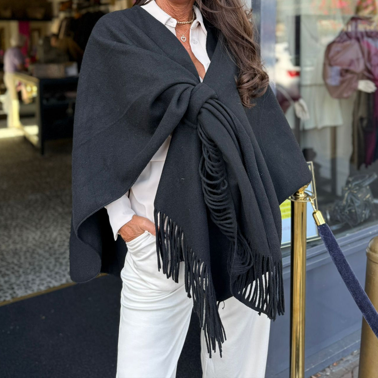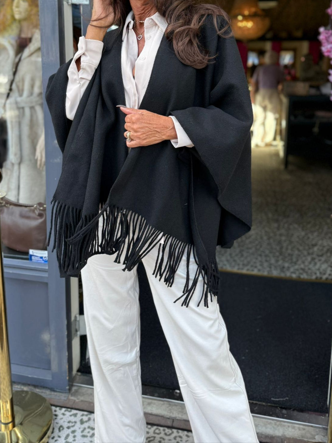 Discover the Luma Poncho with elegant fringe detailing, designed to be both chic and functional. An innovative front loop allows you to secure the poncho in place, ensuring it stays perfectly positioned all day or night. Ideal for cool evenings or as a stylish accessory for any occasion, this poncho is sure to become your new favorite wardrobe staple!